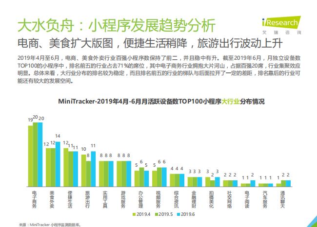 近期艾瑞咨询发布了2019 年微信小程序市场研究报告,对小程序市场进行分析,对不同行业的行业发展趋势进行总结。作为小程序行业的开发者或代理商或商家使用者,可以通过研究报告了解微信小程序发展的一些规律特点,对一项应用或者服务更适合小程序端还是APP端有初步的判断标准,更好的在小程序行业里共同进步。